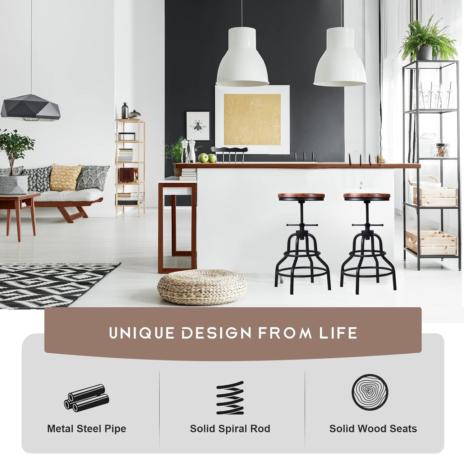 Designed for comfort and convenience, our bar stools incorporate a 360° rotating lift mechanism, allowing for effortless swiveling and easy access. The solid spiral rod and metal steel pipe frame provide robust support, while the solid wood seats offer a natural and inviting perch for hours of relaxation and enjoyment.